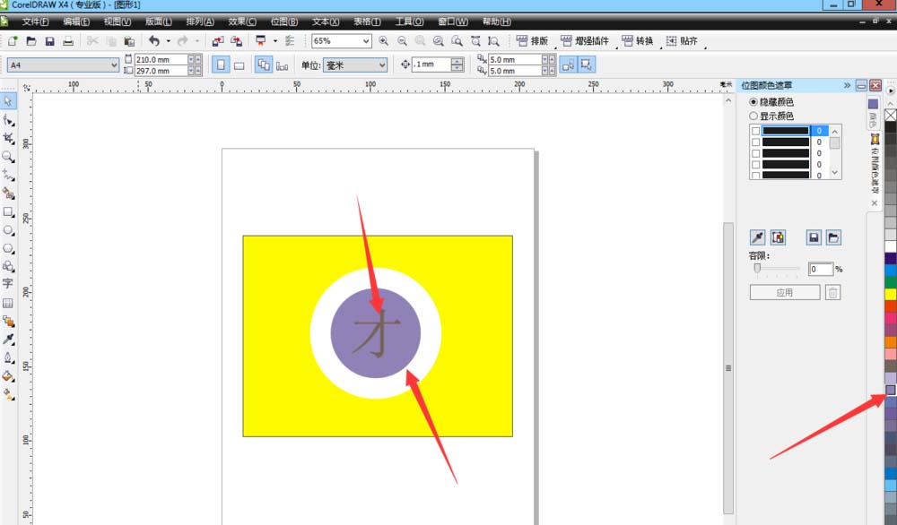 3、復制一個圓,等比放小,填充不同顏色,居中對齊。并在中部放上需要的字