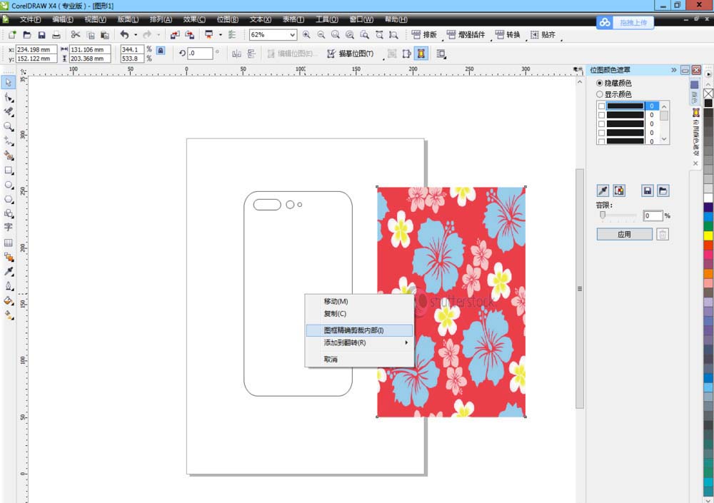 5、右鍵拖住圖片放在手機殼內選擇圖框精確裁剪內部。