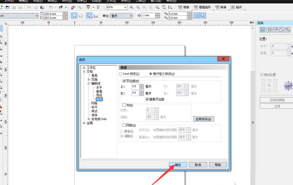 4、在輔助線里選擇預設——自定義——頁邊距設置為3.
