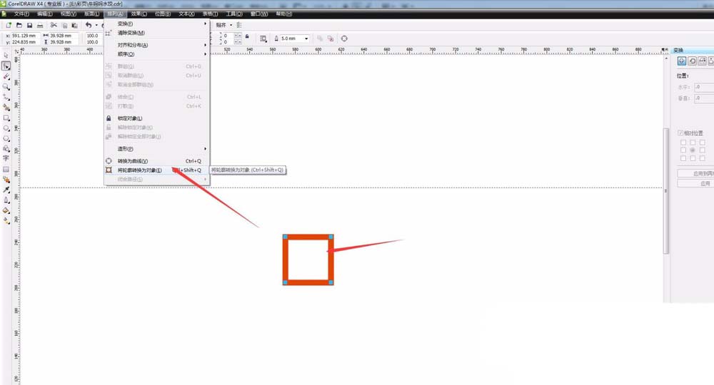 3、選中正方形,將輪廓線轉化為對象。在排列菜單中找到將輪廓轉化為對象命令。這樣就不是線了,然后在屬性欄中有一個貼齊的圖標,選擇貼齊對象。繪制一個跟正方形的邊等寬的矩形