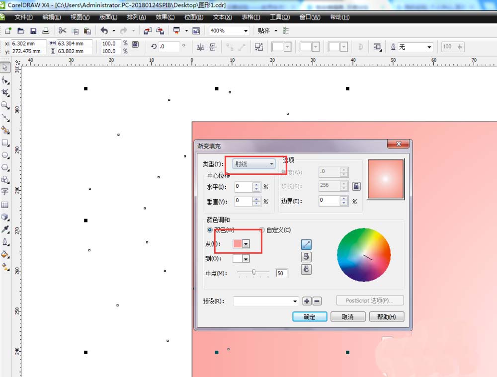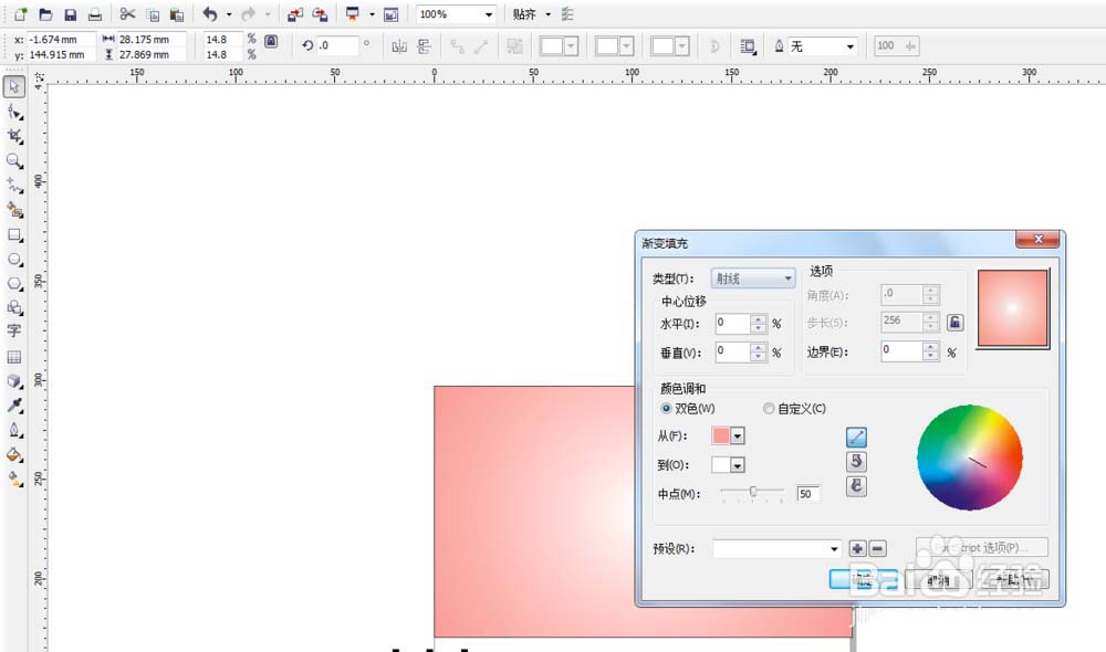 7、去掉輪廓色,填充漸變粉色,射線漸變,如圖