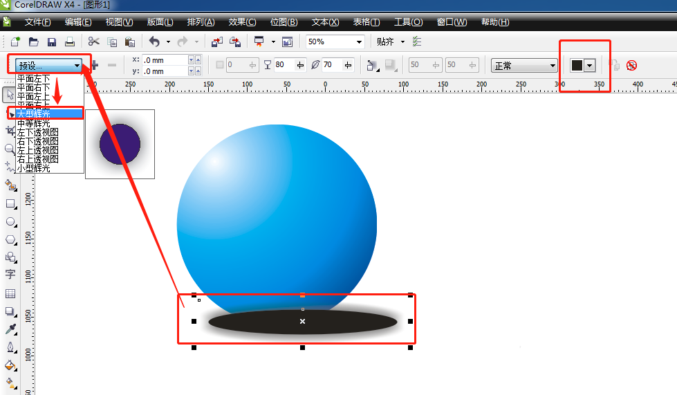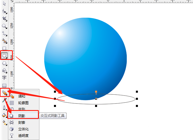 6、使用圓形工具,在繪制好的球體下面畫一個橢圓,位置根據光源適當調整,并執行陰影工具,稍后會用它來制作投影效果。