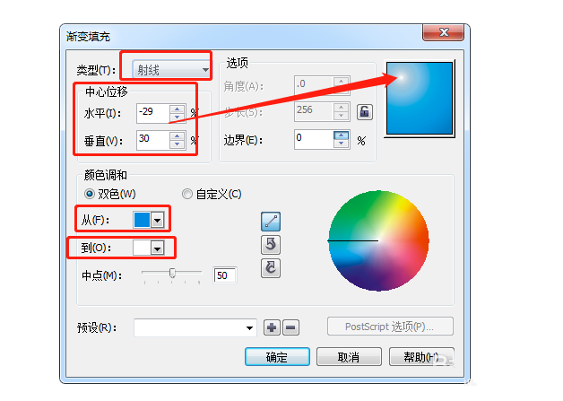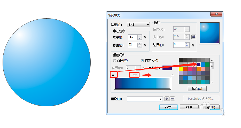 2、設置填充類型為“射線”,中心位移設置光源進入點(可直接在右側預覽圖中拖動),設置球的顏色為藍色。