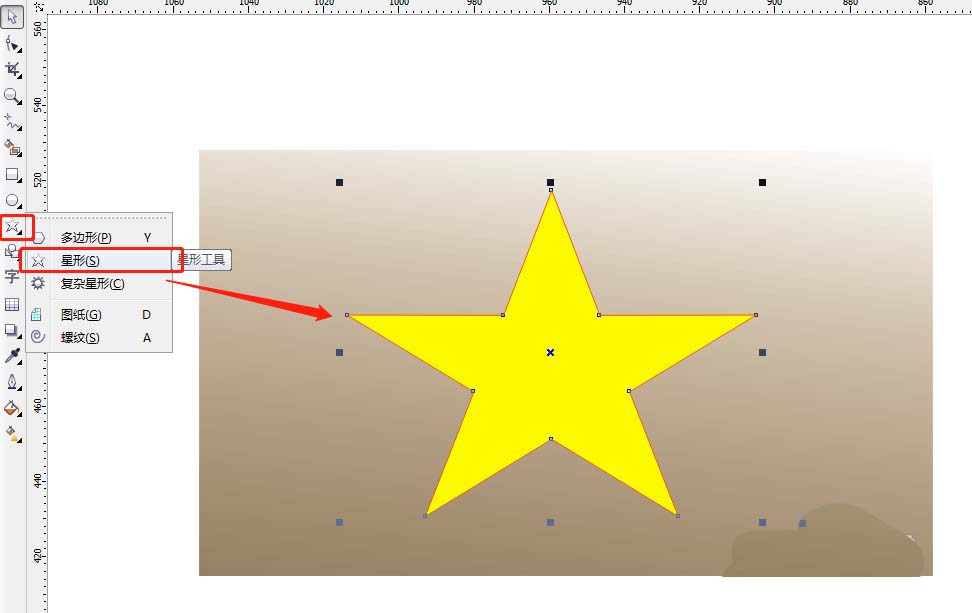 2、選擇星形工具繪制一個(gè)五角星,并填充黃色,邊框填充紅色。