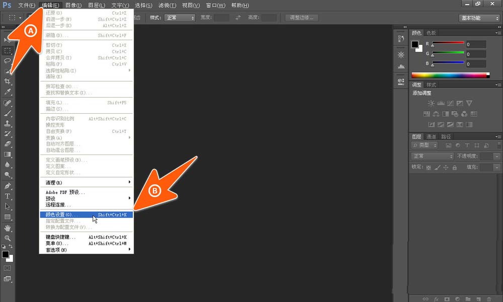 6、通過上面步驟把CDR里面的顏色管理設置好后,現在,再打開PS,依次點擊到顏色設置項,如下圖箭頭2所指。