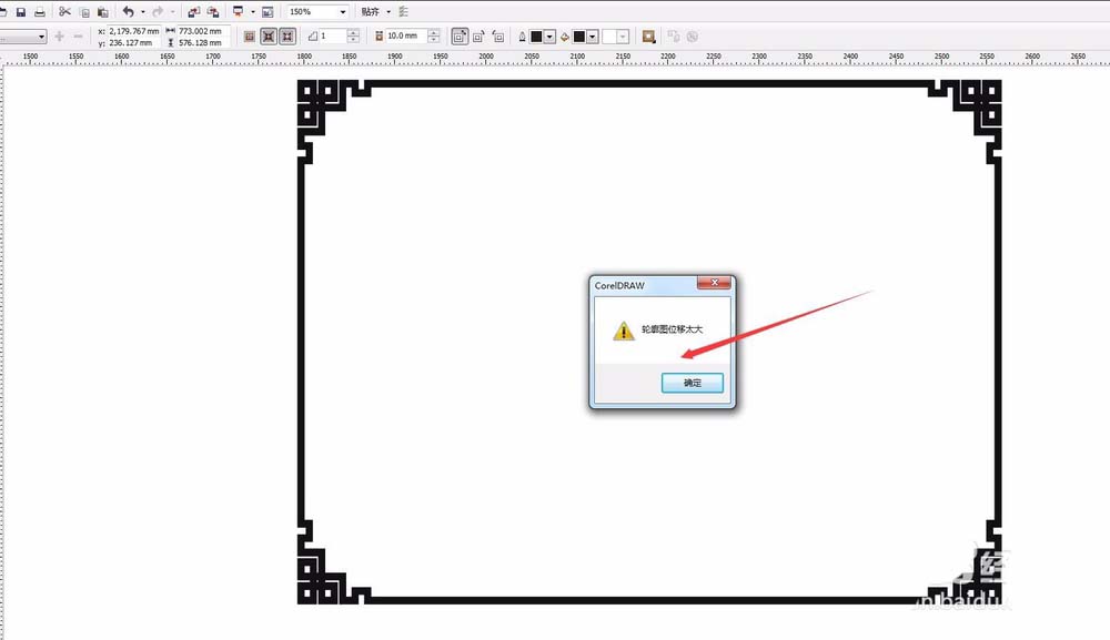 3、在屬性欄中選擇向內的選項,但是彈出一個警告窗口,輪廓位移太大,不能進行操作。沒關系.我們可以先將屬性欄中的數值改小一點,就可以進行輪廓圖的操作了。比如我將輪廓圖的衛衣更改為2。然后可以看到邊框線之內出現了一個小的
