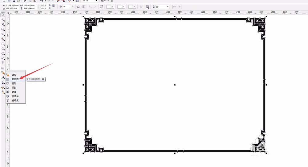 2、我們想到,可以利用輪廓圖來完成操作。選擇工具箱中的調和工具組,按住不動,會彈出一個工具組,有一個輪廓圖的工具,選則這個輪廓圖。因為我們想要讓線條變細,所以,輪廓圖要向內。