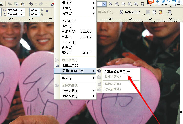 7、將鎖定的對象解除鎖定,然后選擇圖片,右鍵拖動至形狀內,松開鼠標,圖框精確剪裁,放置容器中。可以利用形狀工具裁剪掉多余的,減小空間。完成。如果位置不準確,可以進入圖框編輯內容,調整到適合的位置,結束編輯。完成。