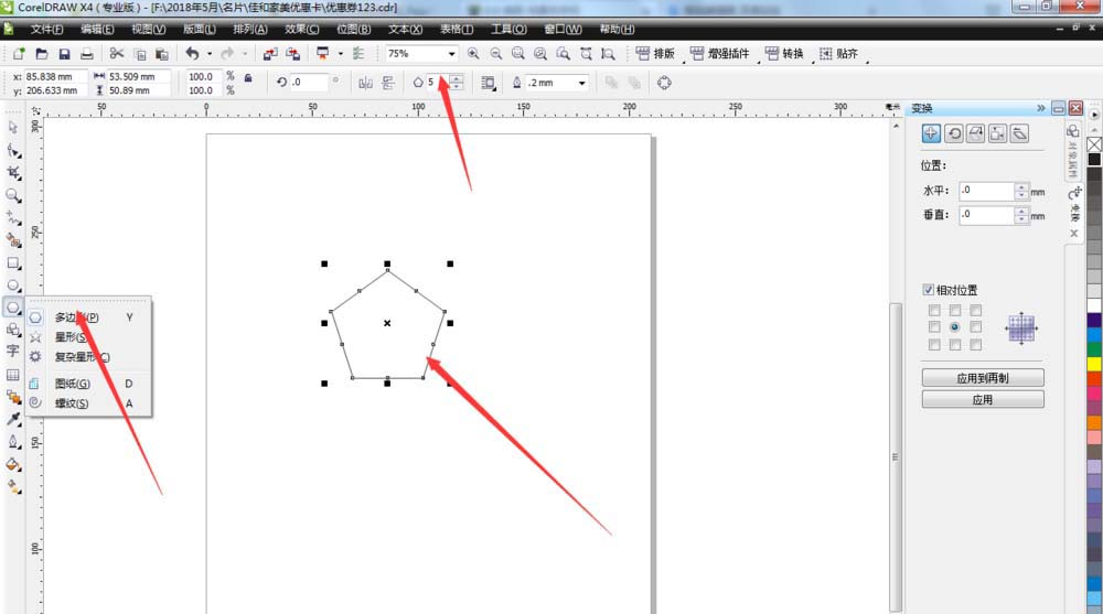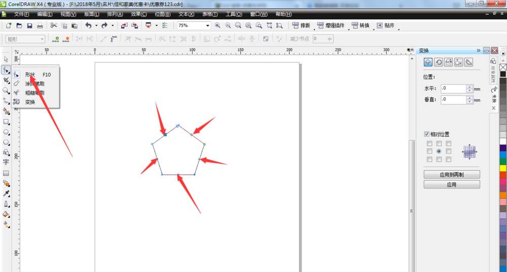 2、單擊多邊形工具,按住Ctrl鍵畫一個五邊形,再單擊形狀工具,把多邊形邊上的節點全部去掉。