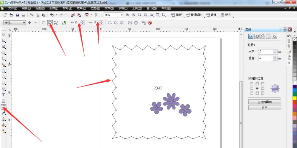 6、選擇矩形工具,畫一個矩形調整好大小,再單擊變形工具選擇拉鏈變形參數調整到10到15,選擇平滑變形。