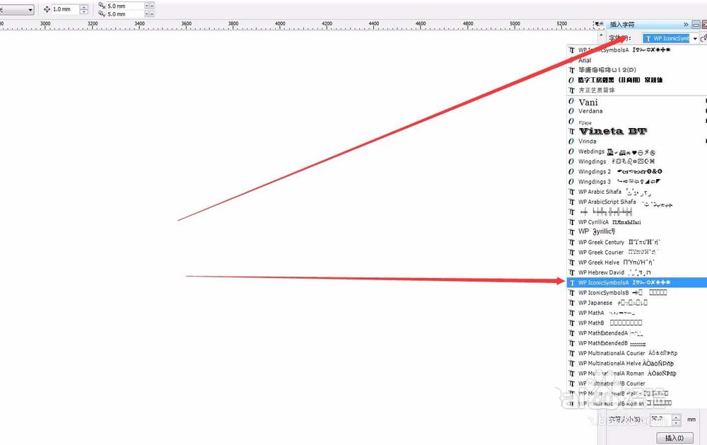 3、在這個(gè)面板中,我們會(huì)看到有個(gè)選擇字體的選項(xiàng)。字體的選擇非常重要。不同的字體對(duì)應(yīng)著不同的符號(hào)類型。那么這么多字體我們要一個(gè)個(gè)來找嗎?那不是耽誤很多時(shí)間?不用的,我們只需要最常用的幾個(gè)就可以了。