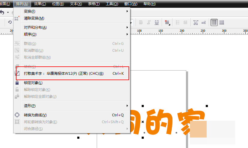 1、打開CorelDRAW,輸入文字。按住快捷鍵ctrl+k打散文字,文字大小調(diào)整。