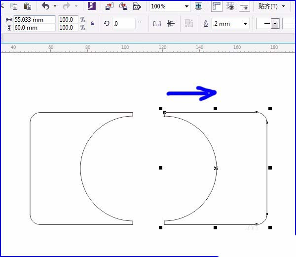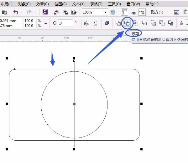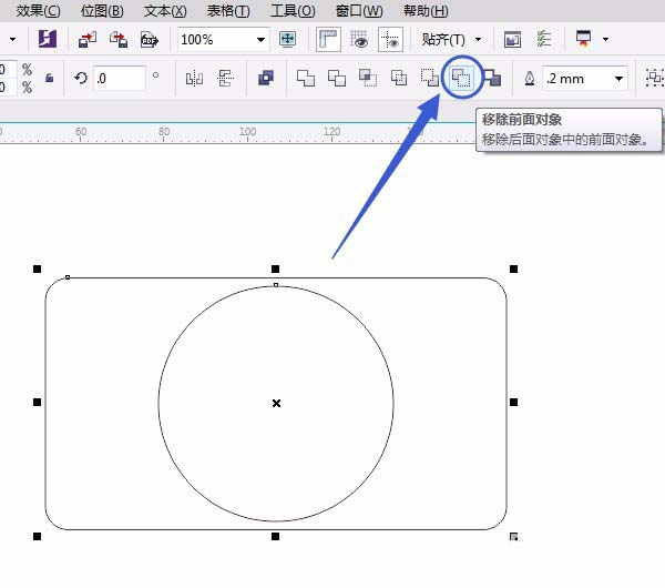 3、按空格鍵切換成“選擇工具”框選矩形和圓,單擊“屬性欄”中“移除前面對象”,如圖:
