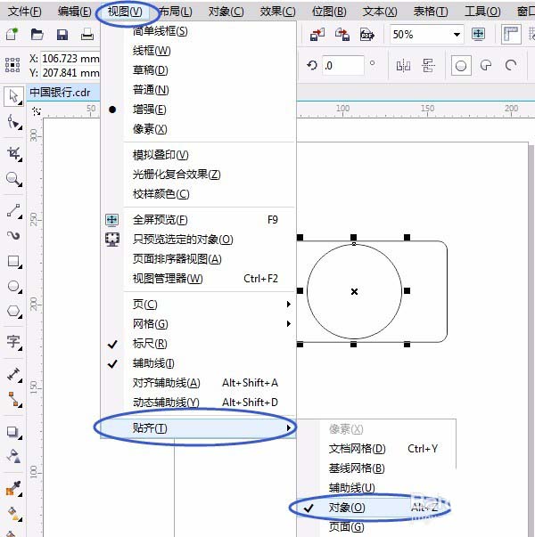 2、單擊“視圖”菜單→貼齊→對象,快捷鍵:Alt+Z,把圖形移動至中間位置(會顯示“中心”兩字),如圖所示