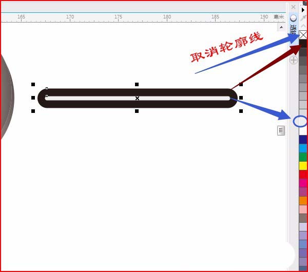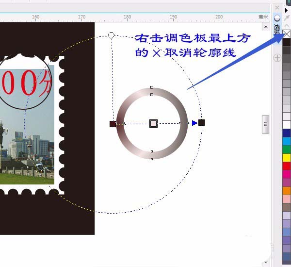 3、單擊選“交互式填充”工具,如圖設置,并右擊“調色板”最上方的×取消輪廓線,效果如圖: