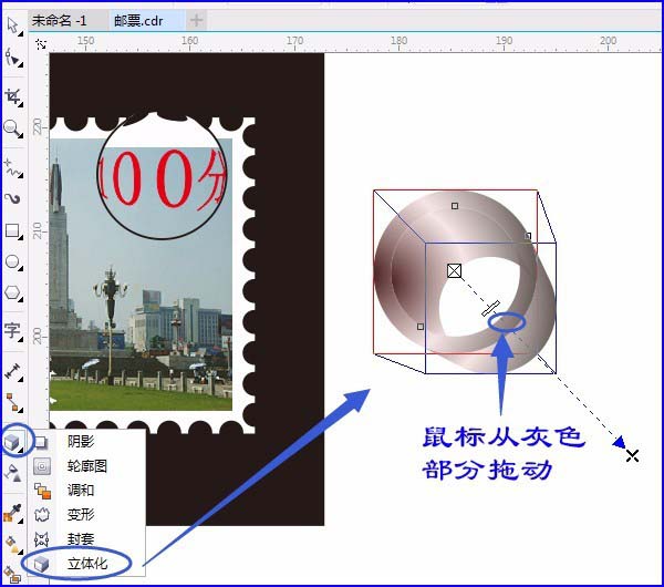4、用“立體化”工具,鼠標從灰色部分拖動后放大畫面再如圖調整: