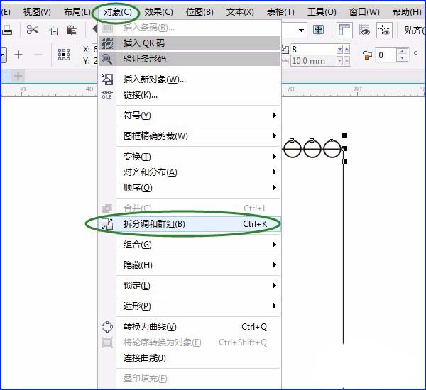 3、單擊選“對象”菜單→拆分調(diào)和群組,快捷鍵Ctrl+K,如圖所示:
