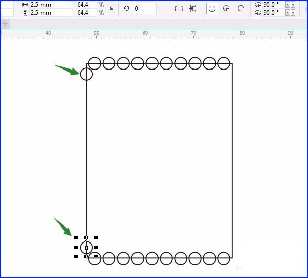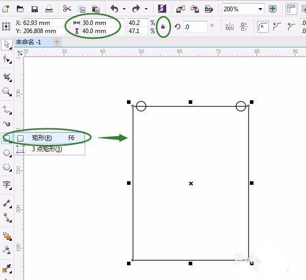 1、用“矩形工具”畫一矩形,在屬性欄改尺寸30×40(毫米),用“橢圓形工具”按Ctrl鍵畫一個小正圓,按Ctrl鍵拖動復(fù)制小正圓在右邊,如圖:
