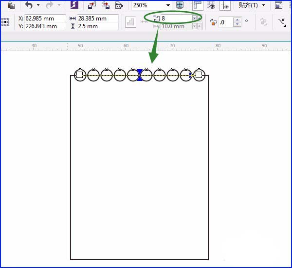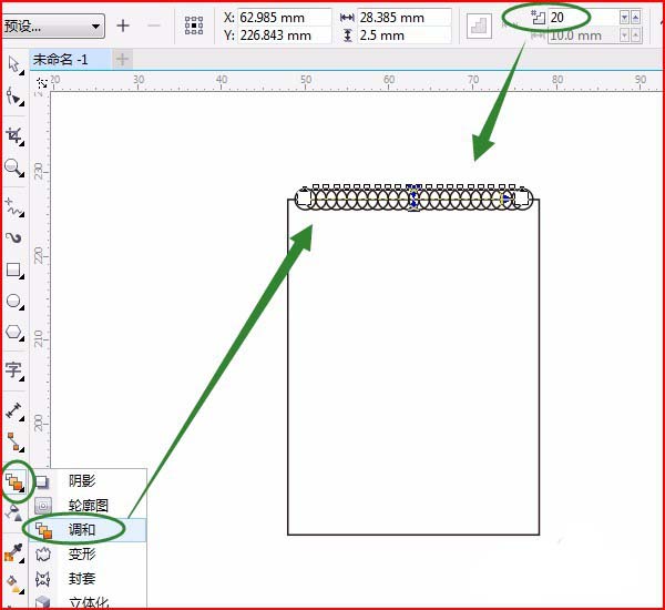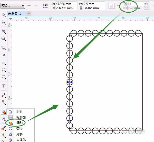 2、單擊“調(diào)和工具”,選左小圓中間位置開始拖動向右小圓中間位置拉出“調(diào)和”,在屬性欄中改數(shù)字,根據(jù)矩形大小改數(shù)字,如:改為8后按回車鍵,如圖: