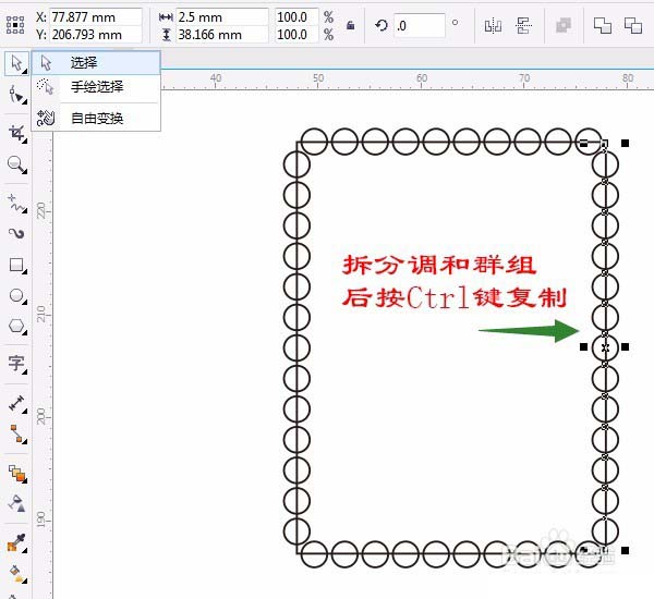 4、按空格鍵切換成“選擇工具”框選所有小圓,按 Ctrl鍵往下移動右擊復(fù)制小圓,如圖所示:
