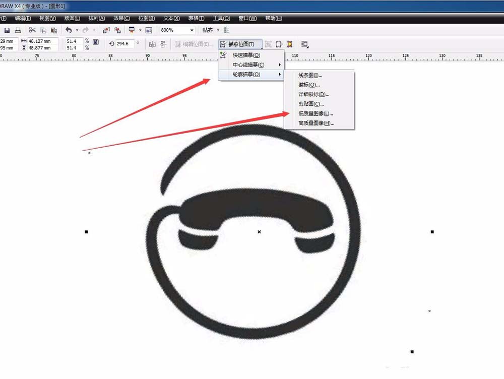 3、看上方我們會看到一個叫描摹位圖的命令,我們選擇輪廓描摹,然后選擇低質量描摹就可以,高質量反而不好,會出現很多的鋸齒,給我們后期調節帶來很大的麻煩。然后單擊確定