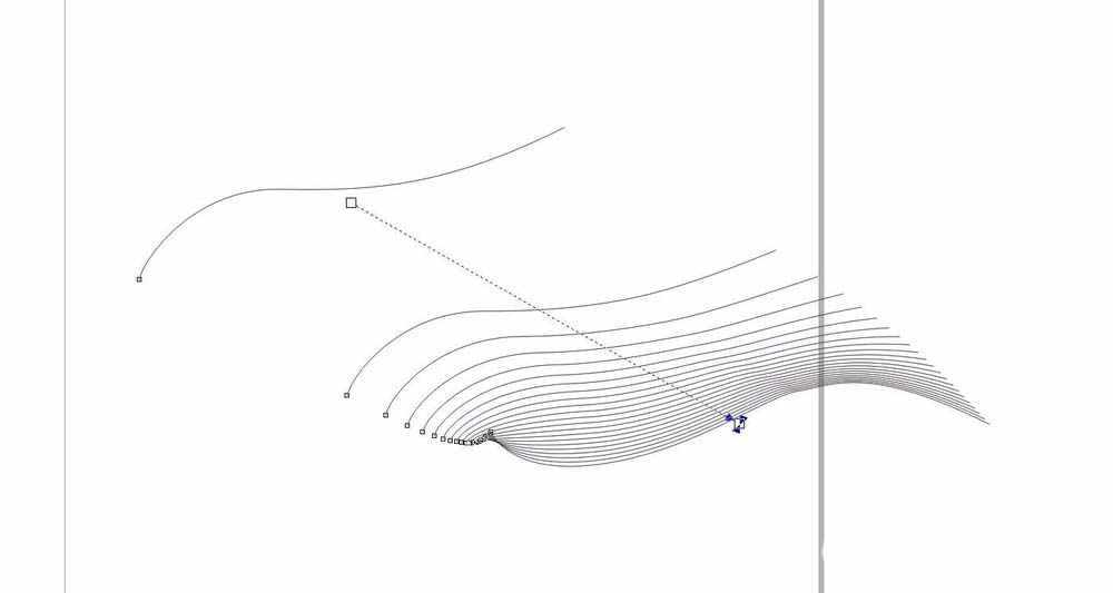 3、然后我們選擇工具箱中的調和工具,對兩條曲線進行調和處理。用鼠標拖動,從第一個曲線開始,拖動到第二條曲線,我們可以看到出現了很多的線條,這個時候就可以放開鼠標了。這樣調和效果就做好了。