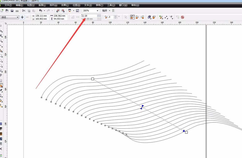 5、我們可以看到屬性欄中有一個數量的選項,我們想要做出完美的效果,就需要改變他的數量,現在默認的是20,我們可以將數量改變成200,這樣就可以看到不一樣的效果了。不再是簡單的幾個線條了。