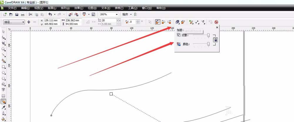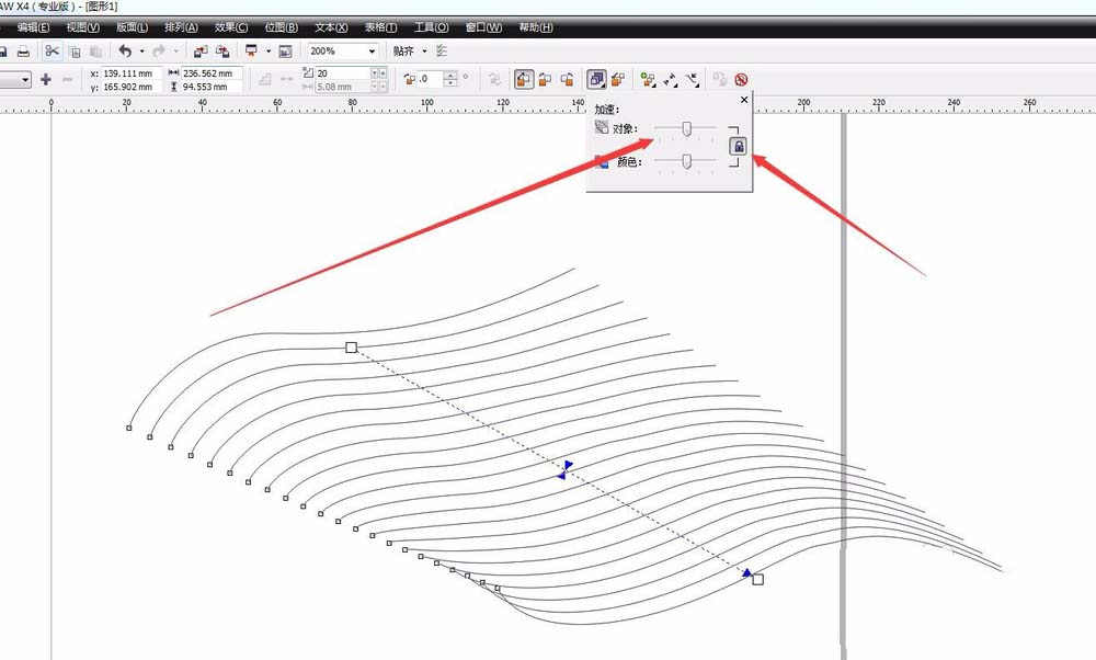 4、突然發現,我做的調和分布非常不均勻,這是怎么回事呢?在屬性欄中,我們可以看到一個選項叫做對象和顏色加速。我們點擊一下會發現,有兩個滑塊,一個控制對象,一個控制顏色,我們只需要將滑塊拖到最中心的位置,這個時候對象就是等分排列的了。