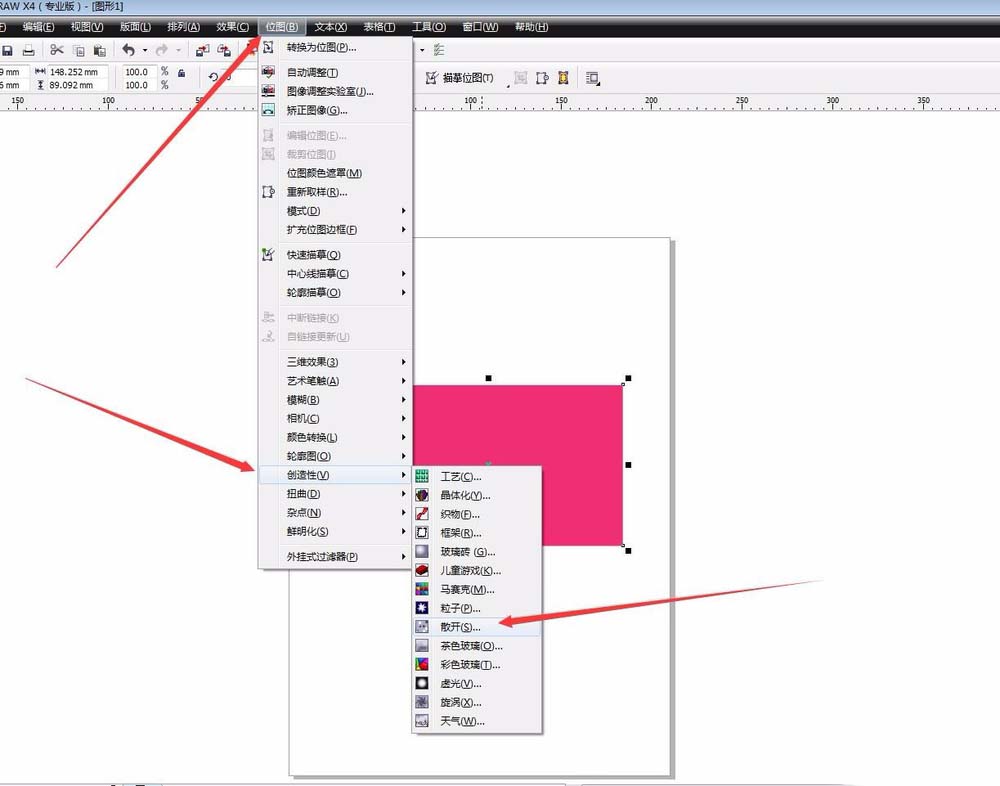 4、選擇菜單欄位圖,里面有一個創造性。我們選擇里面有一個散開,看看效果,我們可以輸入數值,可以拖動滑塊進行設置。然后,有一個預覽的按鈕,我們可以預覽出效果,調整到合適的大小,然后點擊確定。這樣毛邊的效果就出來了