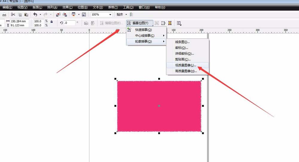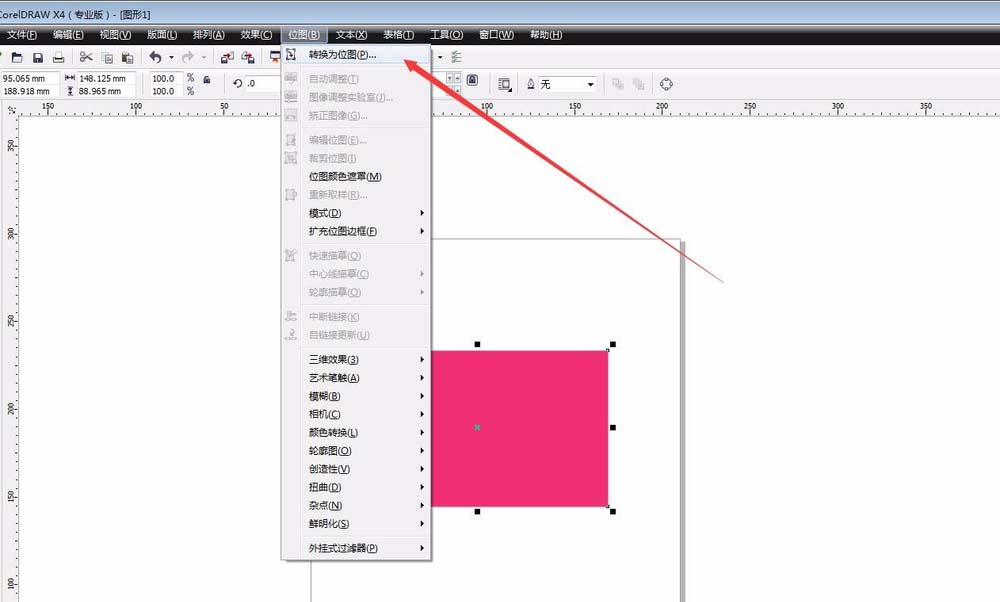 3、選中矩形,把它轉化為位圖。我們選擇位圖-轉化為位圖,分辨率可以設置高一點,如果怕卡的話150也是可以的,然后我們對位圖進行調整。