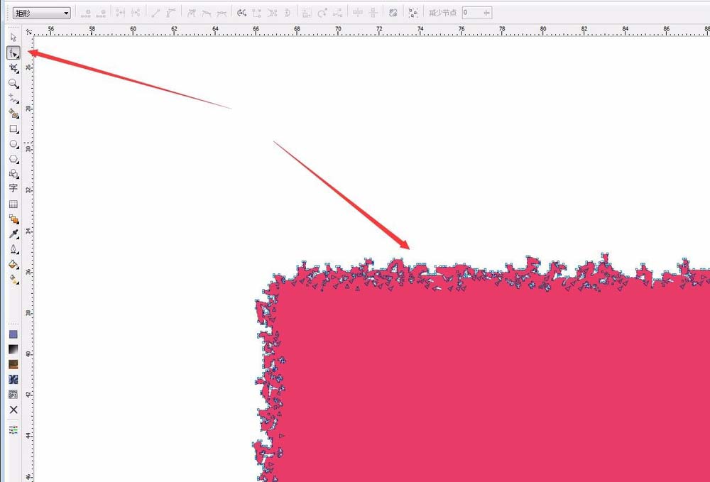 6、然后就得到了一個有毛躁邊緣的矩形。我們選擇形狀工具,點擊矩形,可以看到邊緣的位置都是節點,我們可以手動的對不滿意的地方進行細微之處的調節,讓毛躁的邊緣更加有感覺,直到自己滿意為止。