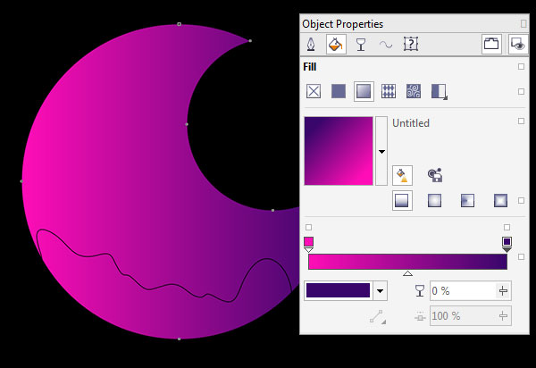 用挑選工具選擇月亮 。在"對(duì)象屬性"泊塢窗中,將線(xiàn)性噴泉填充應(yīng)用于從洋紅到紫色的月亮。