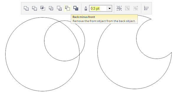 使用橢圓工具(F7)繪制一個(gè)圓(按住Ctrl以保持一致)。用小圓圈重疊第一個(gè)圓的右上方。在屬性欄中,選中兩個(gè)圓圈,然后點(diǎn)擊Back Minus Front從較大的圓圈中刪除較小的圓圈,形成一個(gè)胖乎乎的月牙形。
