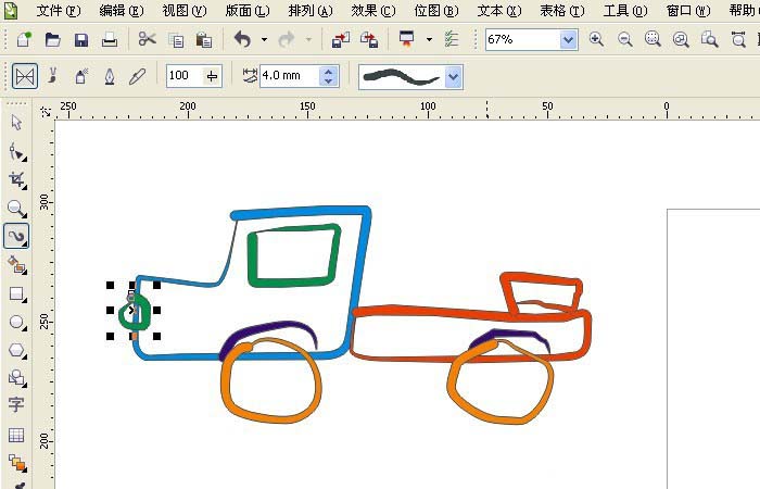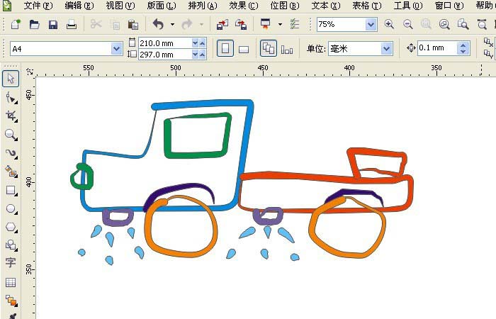 4、接著,用藝術(shù)筆工具繪制出灑水車車體車輪的線條部分,并填充為棕色,這樣,灑水車就看起來好看了,如下圖所示。