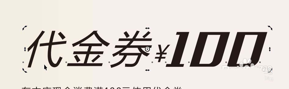 4、用選擇工具,雙擊文字,代金券¥100,出現(xiàn)雙箭頭,斜切。如圖。