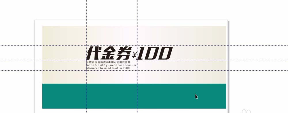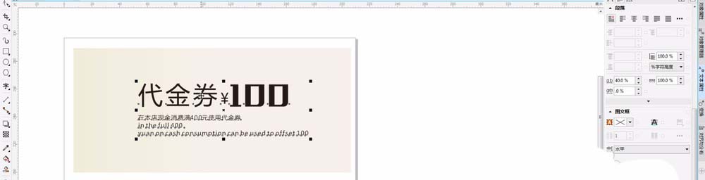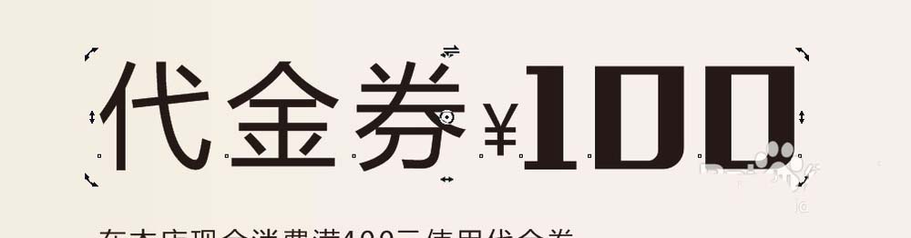 3、輸入文字,代金券¥100,在本店現(xiàn)金消費滿400元使用代金券; in the full 400 yuan on cash consumption can be used to offset 100;并調(diào)整文字大小。代金券¥用微軟字體100用造字工房力黑(非商用)常規(guī)體,沒有字體在網(wǎng)上找,找不到找我,幫我點贊。