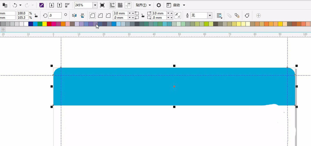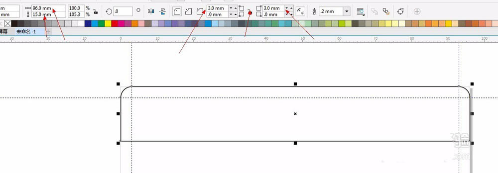 5、再次使用矩形工具,在頁面的上方繪制一個小矩形。如圖所示。設置小矩形的寬:96mm;高:15mm;移動調整到對其第一個矩形上部。設置左右上半部分圓角半徑為3mm;并填充;