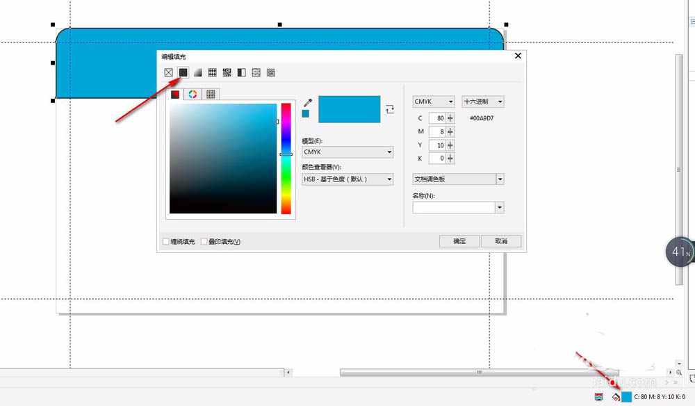 6、小矩形填充藍色。c:80 m: 8 y:10 k: 0;具體如圖 操作就可以。去除輪廓線。