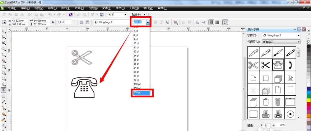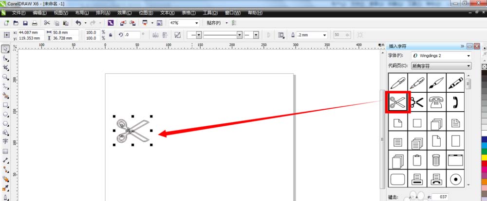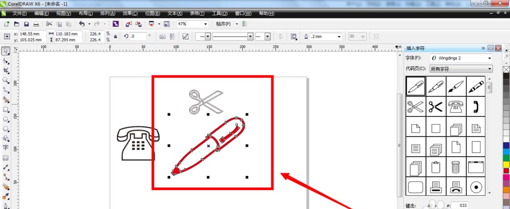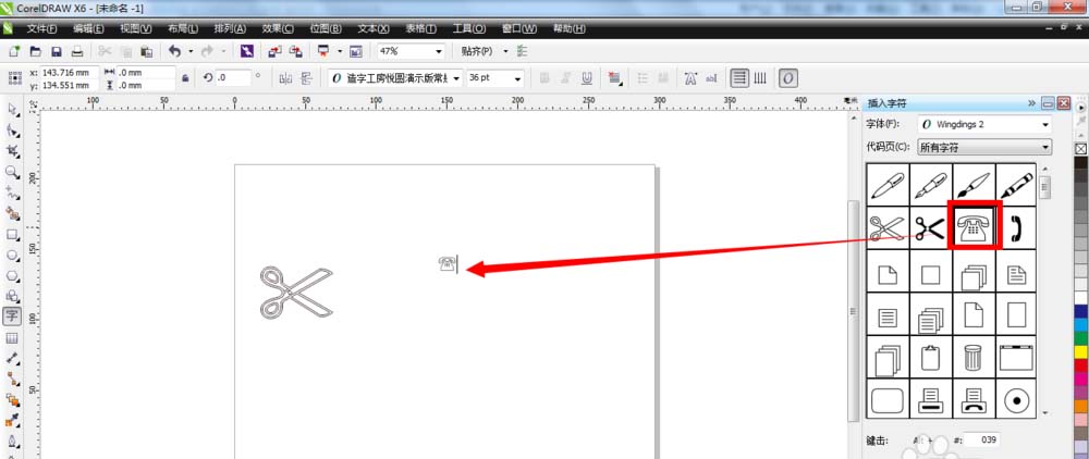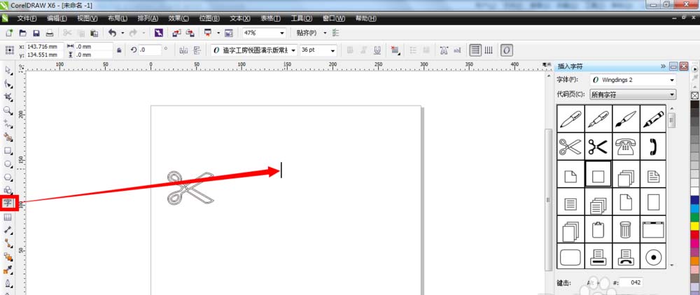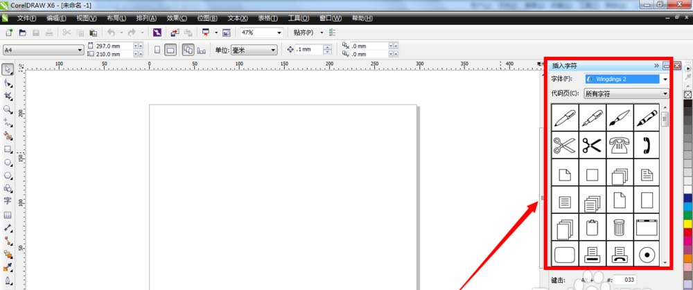 1、使用符號(hào)字符面板上的“插入”按鈕。單擊選中其中一個(gè)符號(hào),比如鋼筆,再點(diǎn)擊下面的“插入”按鈕,即可把符號(hào)插入到空白的頁(yè)面上。