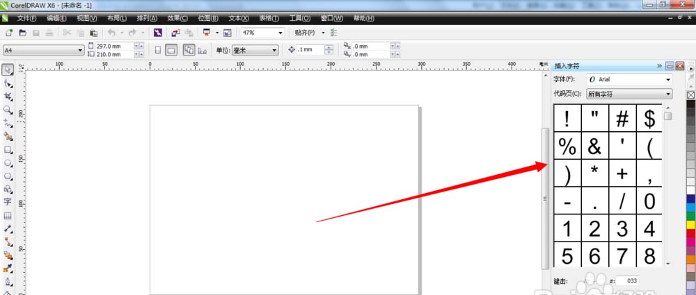 2、接著就可以在cdr軟件右邊出現(xiàn)的“插入字符”面板上看到很多各種各樣的符號(hào)字符