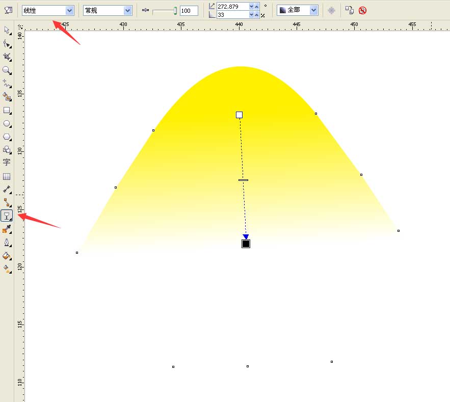 4、選擇交互式調和工具從黃色三角形往橙色三角形拉,步長設置為8如圖