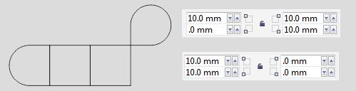 選中圖形,設(shè)置再制偏移,垂直-0mm,確定后按組合鍵Ctrl+D再制一個此圖形,在屬性欄上點(diǎn)擊水平鏡像和垂直鏡像按鈕,填充一個不一樣的便于識別的顏色,效果如下: