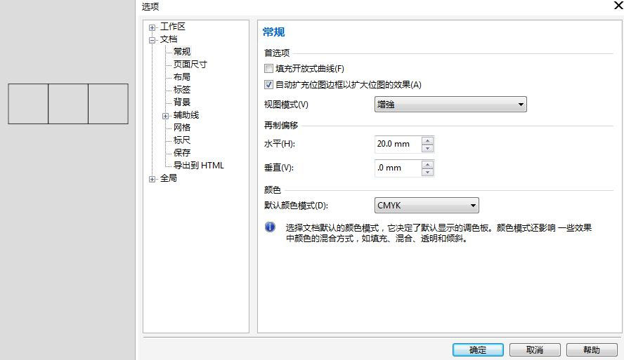 在標(biāo)準(zhǔn)工具欄上單擊“選項(xiàng)”按鈕,打開“選項(xiàng)”對話框,在“文檔”>“常規(guī)”下設(shè)置再制偏移,水平20mm。確定后選中矩形按組合鍵Ctrl+D兩次再制兩個一樣的矩形。