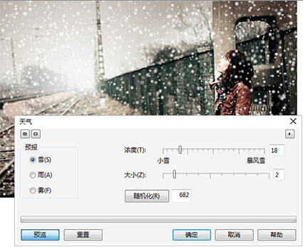 5、選擇先前復制備用的圖片,執行“位圖”→“創造性”→“天氣”,調節對話框中參數。