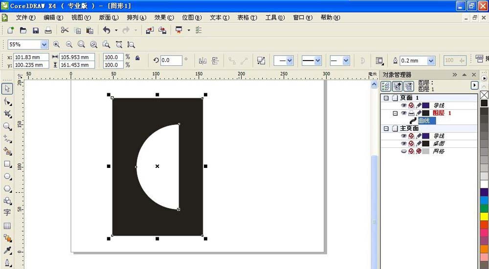 1、新建一個橫向的空白文檔,選擇橢圓工具,按住crl鍵繪制正圓,然后選擇矩形工具,選擇挑選工具,將矩形選中,移動到矩形的邊緣開始調整到圓形的中心位置。