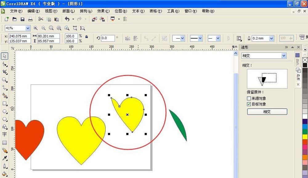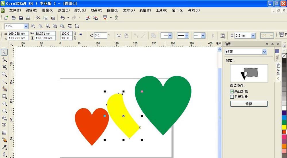 3、選擇修剪對象,然后選擇排列,造形,修剪命令,選擇大桃心對象,然后制定為來源對象,選擇修剪工具,然后點擊小一點的桃心,這時候就會裁剪出相應的桃心。