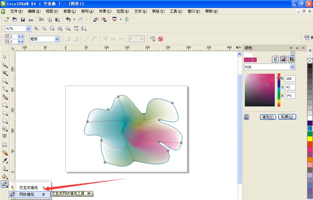 6、也可以自己繪制一個矩形,然后選擇選擇交互式網狀填充工具,對圖形進行填充,設置網絡大小的行列數值,然后設置選取的范圍為手繪,然后進行填充,填充的顏色可以按住shift鍵選擇多個點,然后繼續填充顏色。如圖