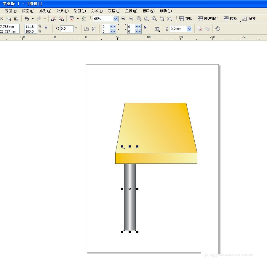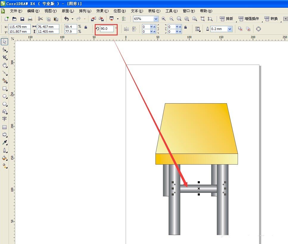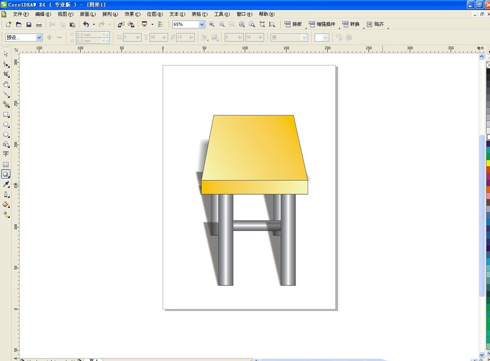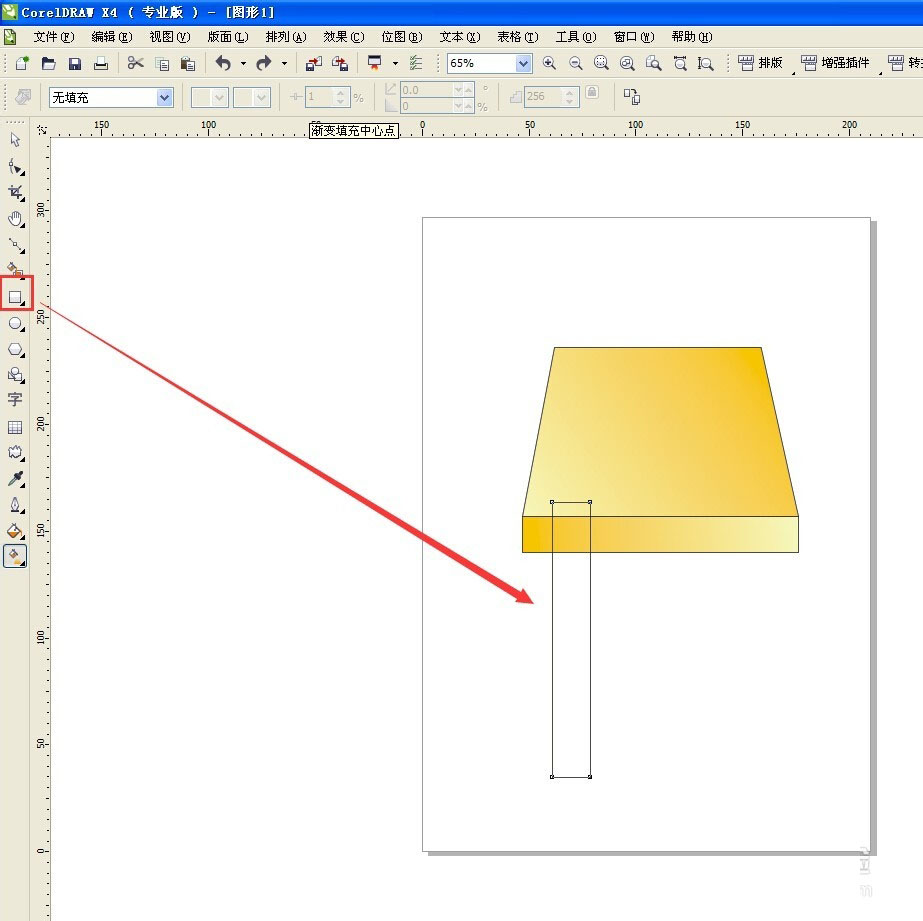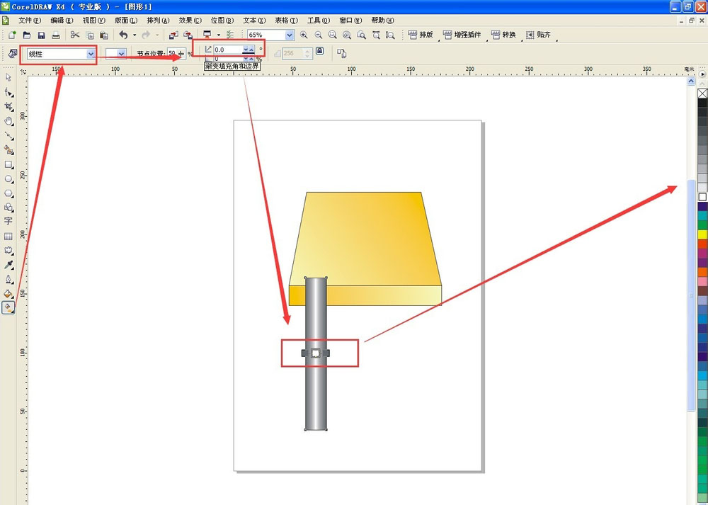 5、用矩形工具繪制一個桌子角,然后用交互式漸變工具拉出一個線性漸變,在屬性欄修改角度為0度,改變顏色為灰白灰色。