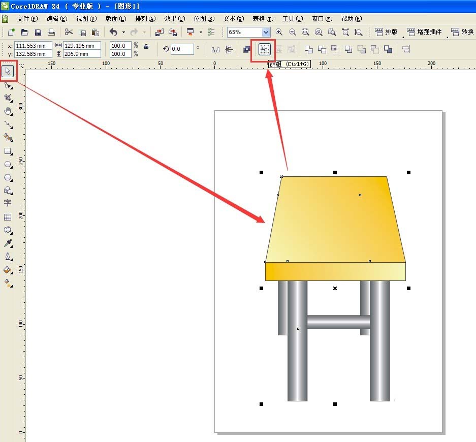 8、用挑選工具框選所有的對象,點擊屬性欄的群組。