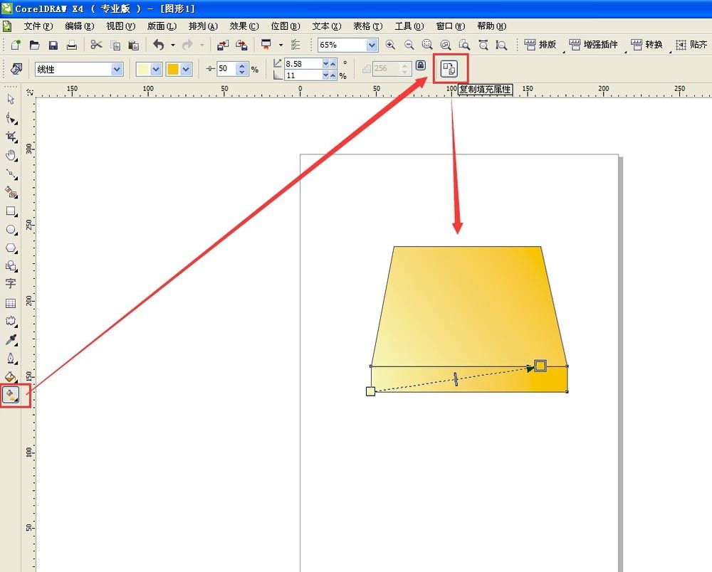 4、用矩形工具繪制一個矩形,然后選擇交互式填充工具,在屬性欄復制一個漸變屬性,在之前那個矩形上點擊鼠標,然后拖動鼠標改變它的漸變方向。